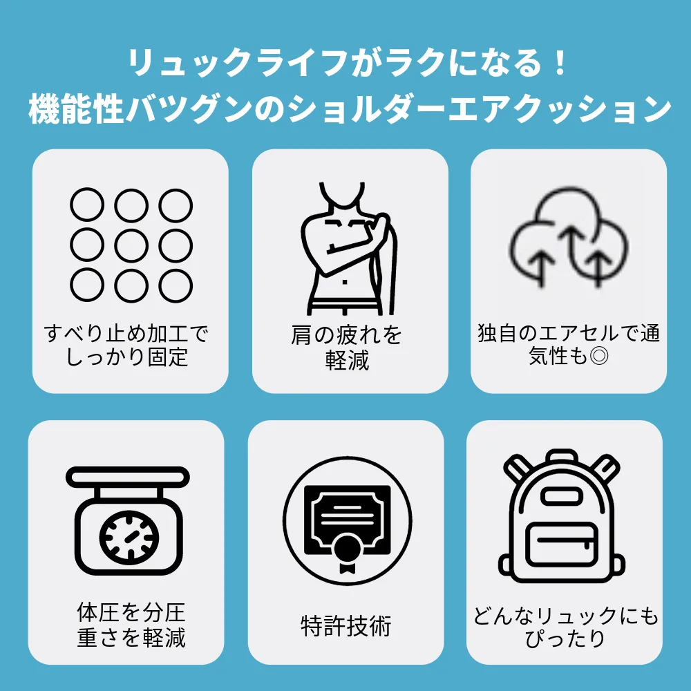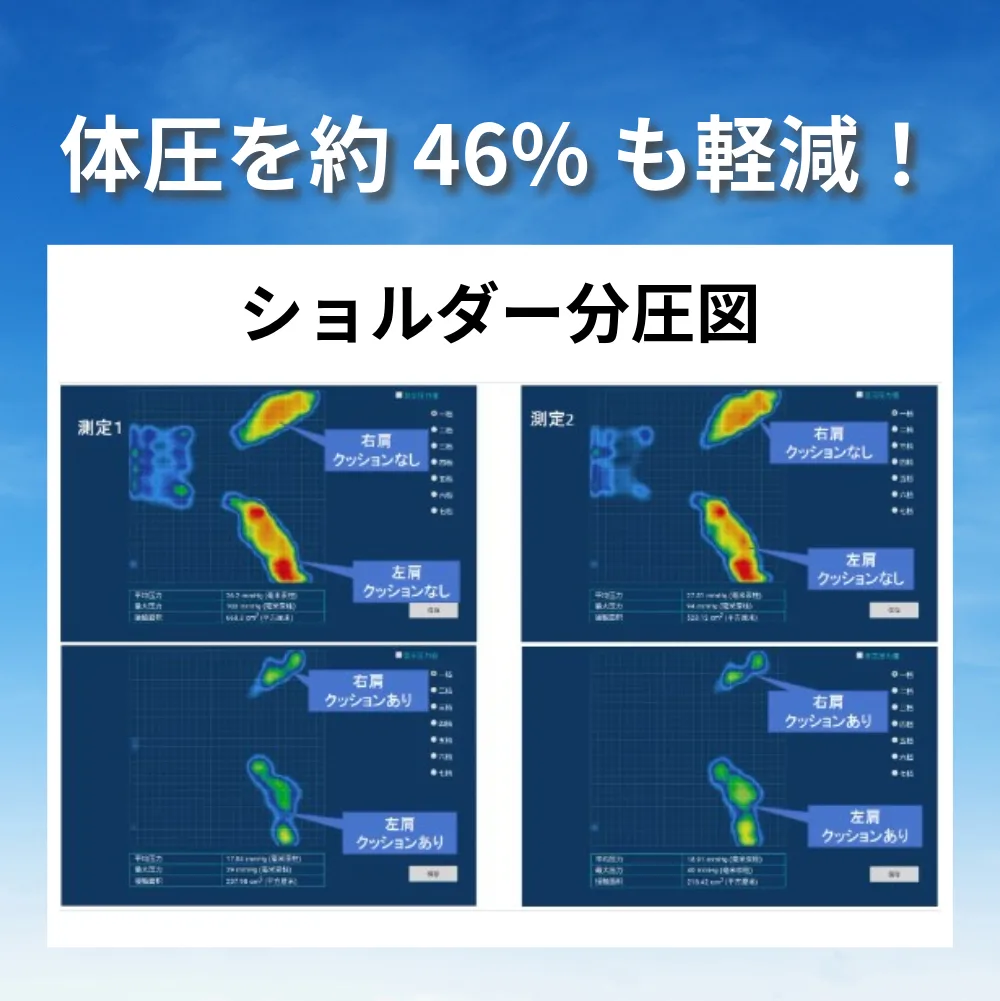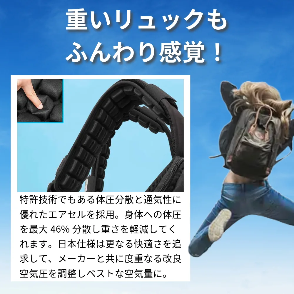 ・独自のエアセルを採用し、身体にかかる圧力を最大46%分散します。これにより肩への負担が大幅に軽減され、長時間の使用でも快適に過ごせます。