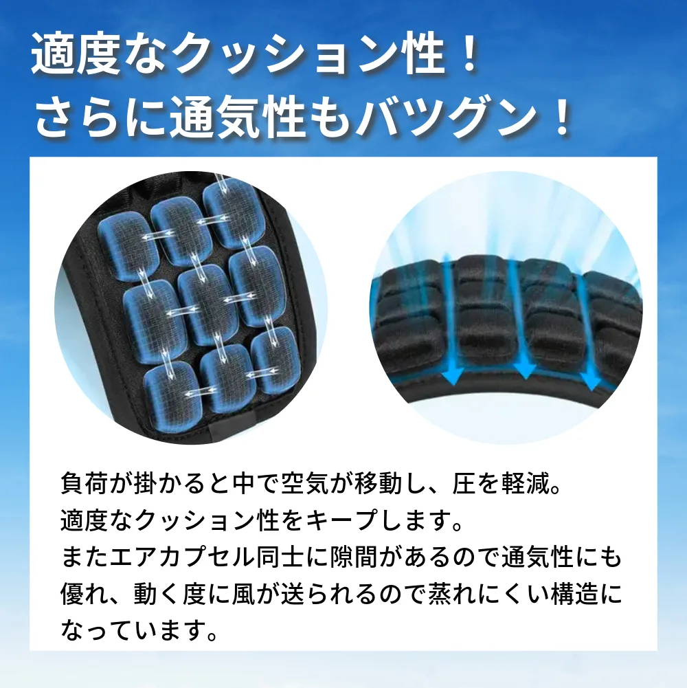 エアセルの構造が通気性に優れており、蒸れを防ぎます。暑い季節や長時間の使用でも、汗による不快感を軽減します。