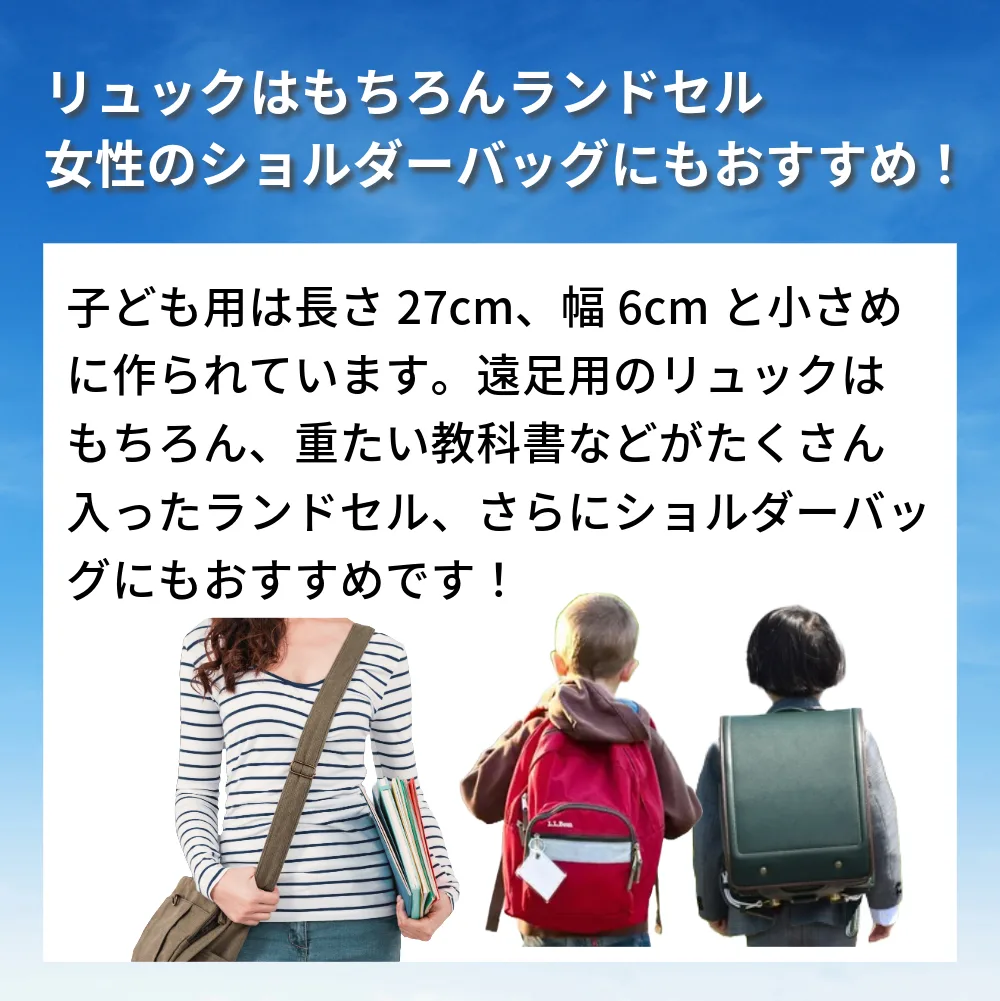 リュックサックだけでなく、小さめのショルダーバッグにも対応。特に女性のオシャレアイテムである片掛け鞄にも最適です。一般的なリュックや、女性・子供用の小さめのバッグにも使用可能です。